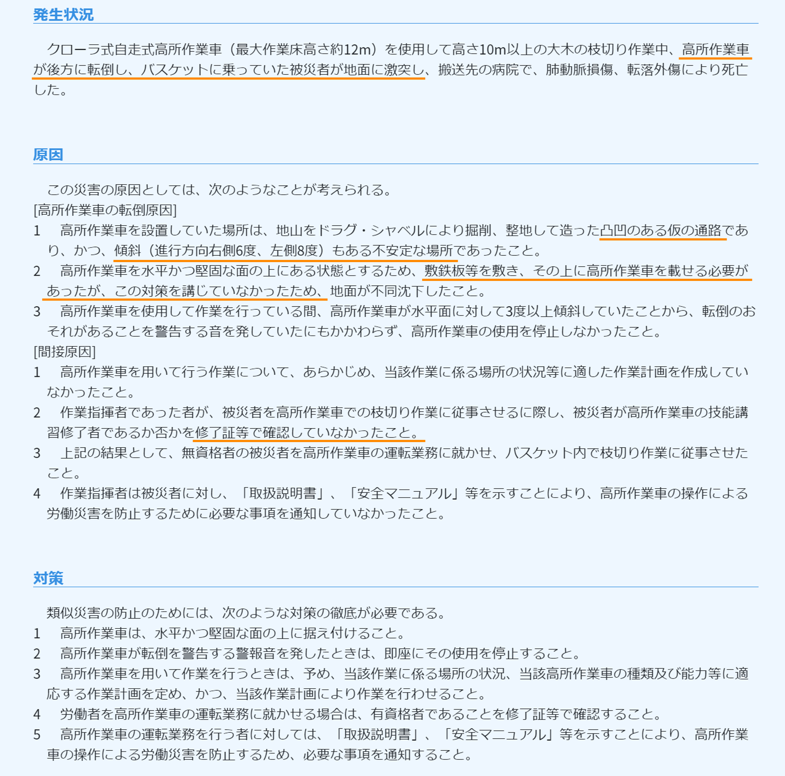 高所作業車が倒れてしまったという事故です。原因は、凹凸があり、かつ傾斜もある場所に高所作業車を設置したことが直接原因とされています。