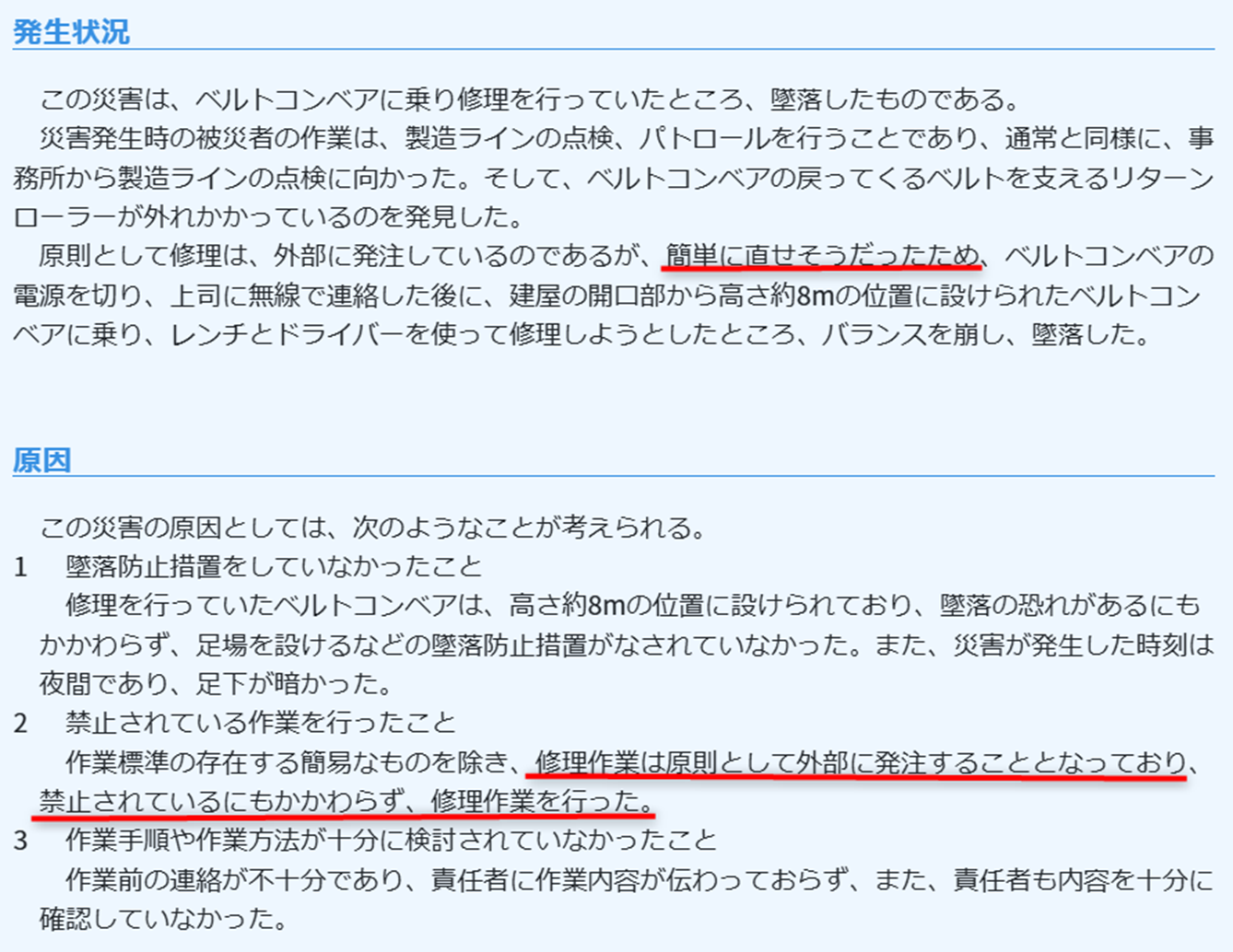 例えば、図2の事例では、機械の修理中に作業員が転落するという事故が発生しました。このケースでは、作業員が「簡単に直せそうだ」と判断し、自ら修理を試みたことが事故の主な原因の1つとされています。しかし、本来、修理作業は原則として外部業者に発注することが定められており、作業員が修理を行うことは禁止されていました。