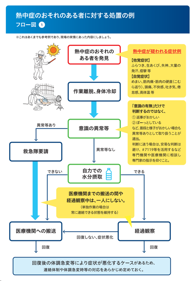 厚労省の発行しているパンフレットには図2のようなフローを示して、熱中症が疑われる症状例をあげつつ、発見した場合の対応について具体的に説明をしています。これもあくまで一例です。