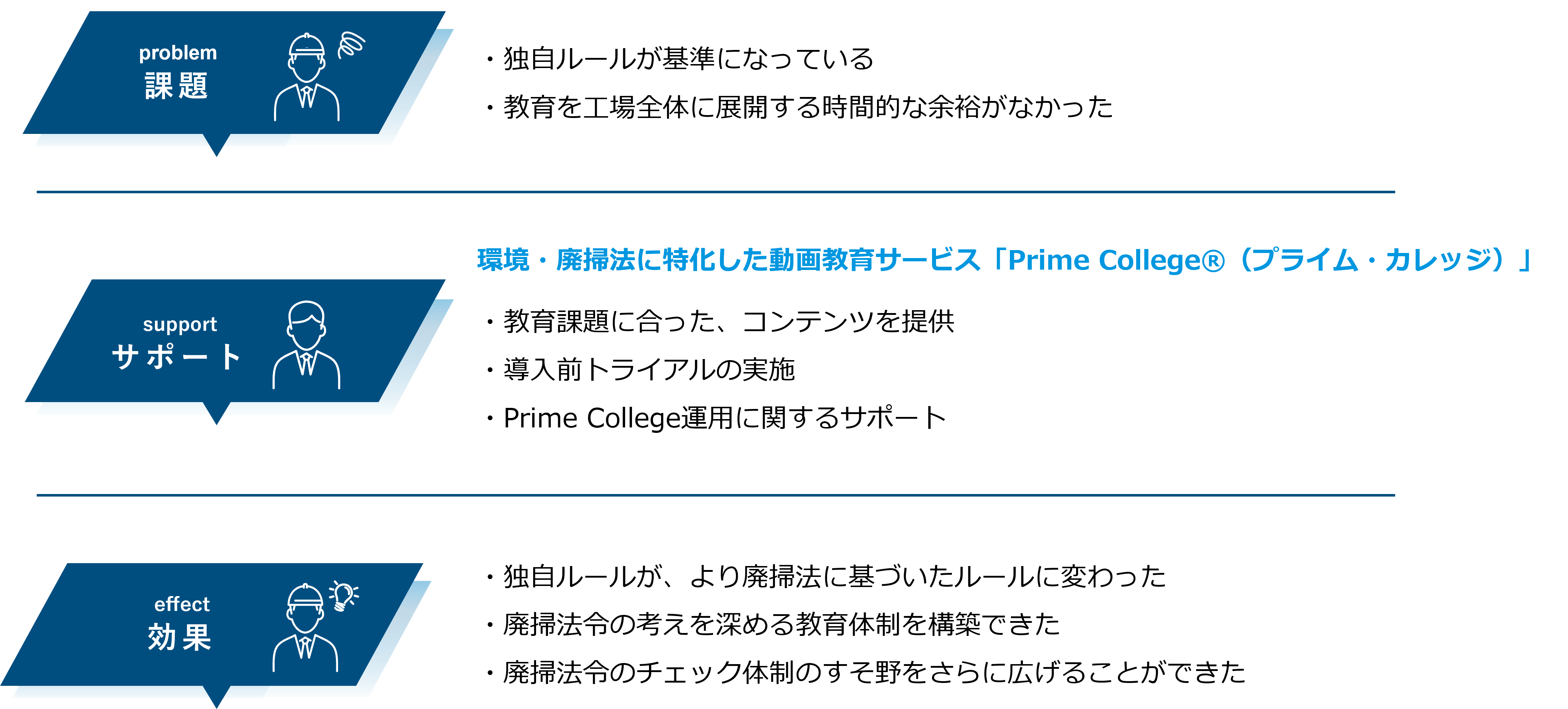 Prime Collegeであれば、従業員一人ひとりが正しい廃掃法知識をつけることができ、さらなるチェック体制の強化を構築するための一助になるのではと思い、導入を決めました。