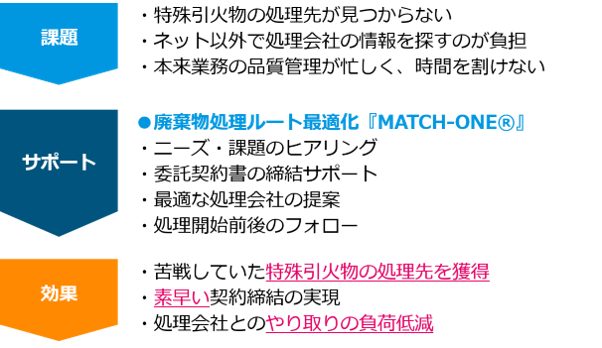 そのセミナーで、担当コンサルタントの廣岡さんを紹介してもらいました。廣岡さんには、本当に根気強く処理先を探していただきました。ネットで処理業者を探せばいくらでも出てきますが、必要な情報は載っていないことも多く、自分で探すには負荷に感じる部分もありました。しかし、廣岡さんはそういった欲しい情報も踏まえて、処理先を提案してくださりました。また、処分業者の担当者との面談なども主体となって設定していただけて有難かったです。